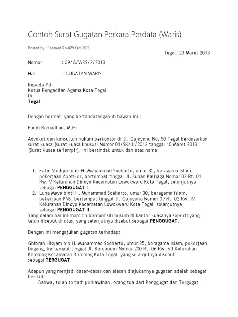 Doc Contoh Surat Gugatan Abdullah Azzam Academia Edu