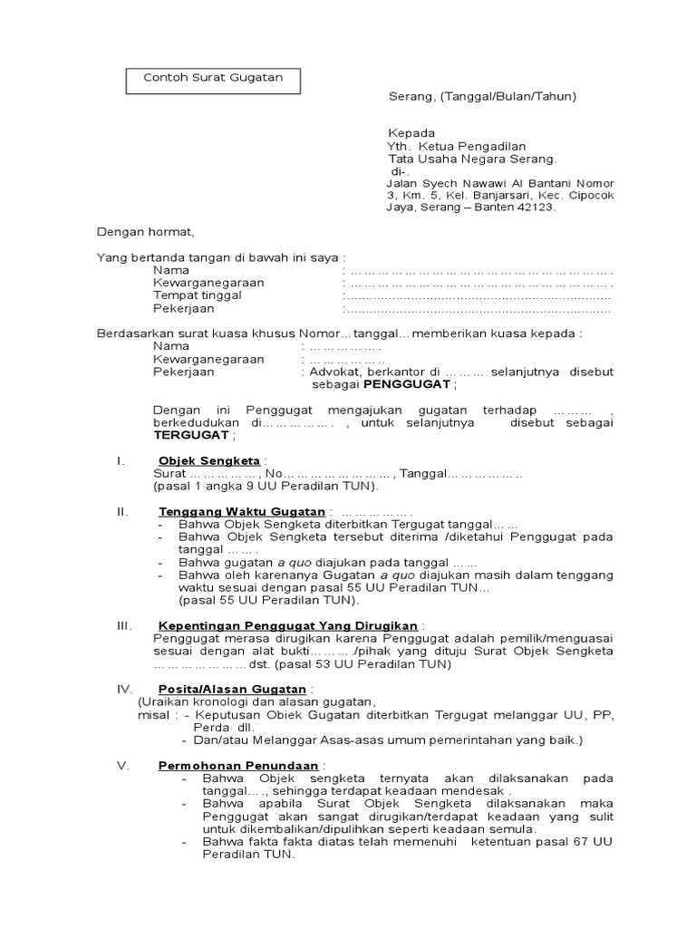Contoh Surat Gugatan Dan Surat Kuasa Pengadilan Tata Usaha Negara